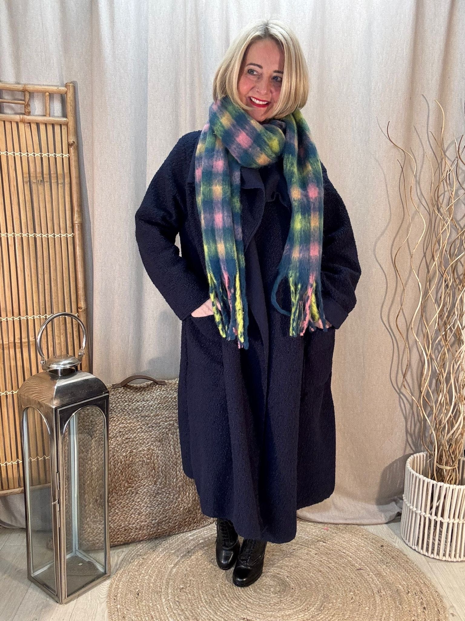 - Easy wearing throw on waterfall front coat in a boucle fabric