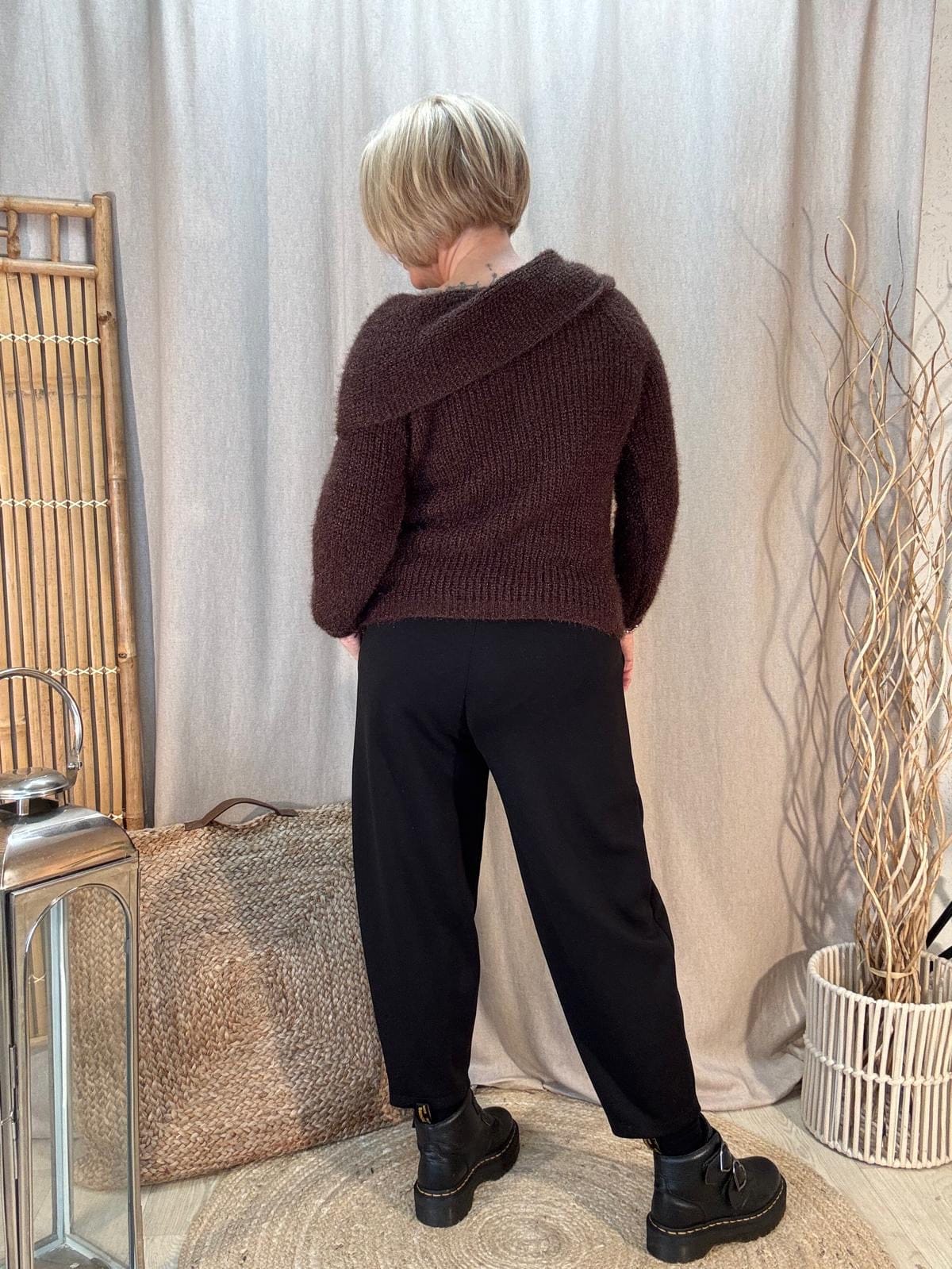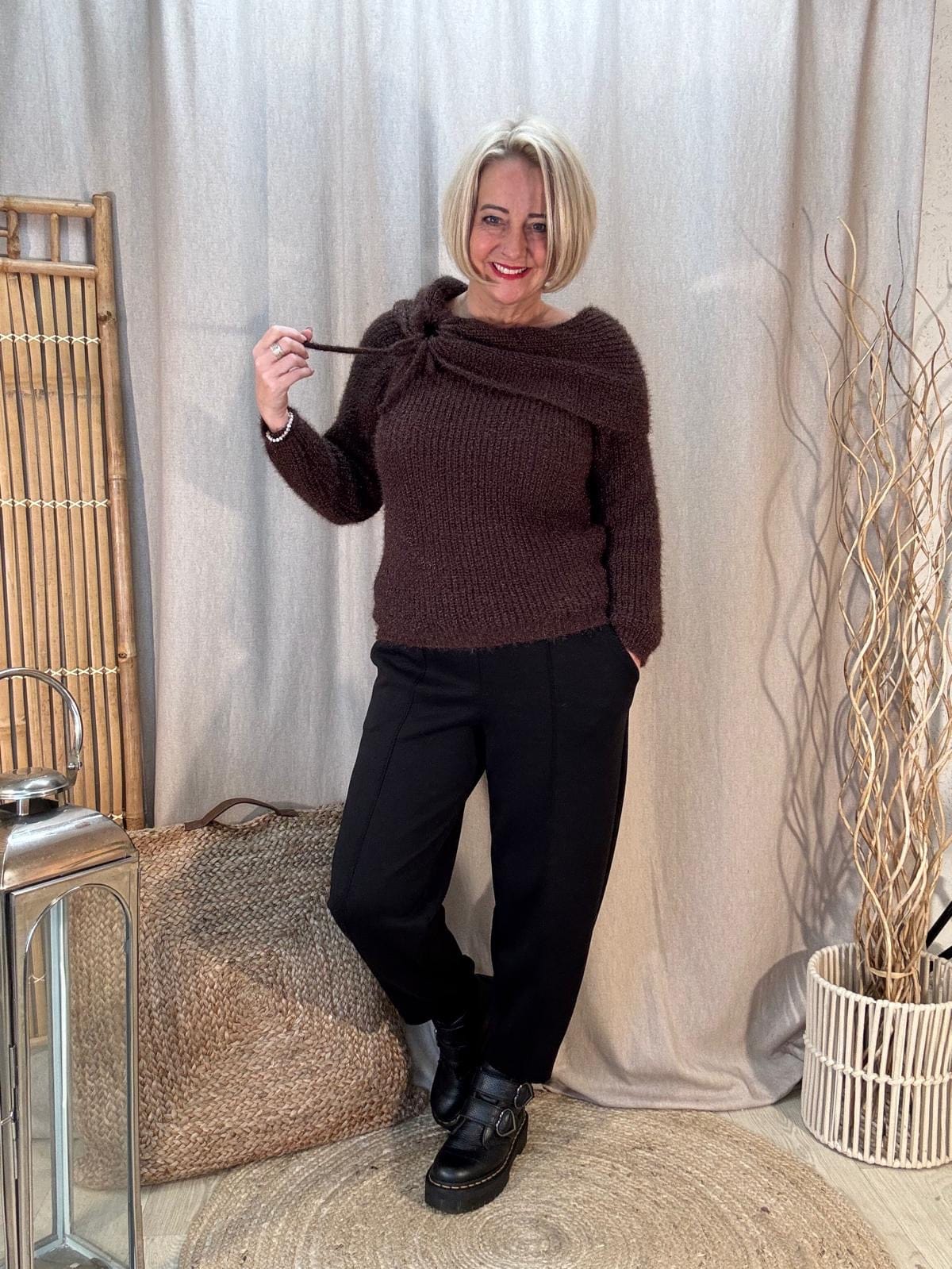 - Striking shimmer knitted jumper with a Bardot neckline & tie feature