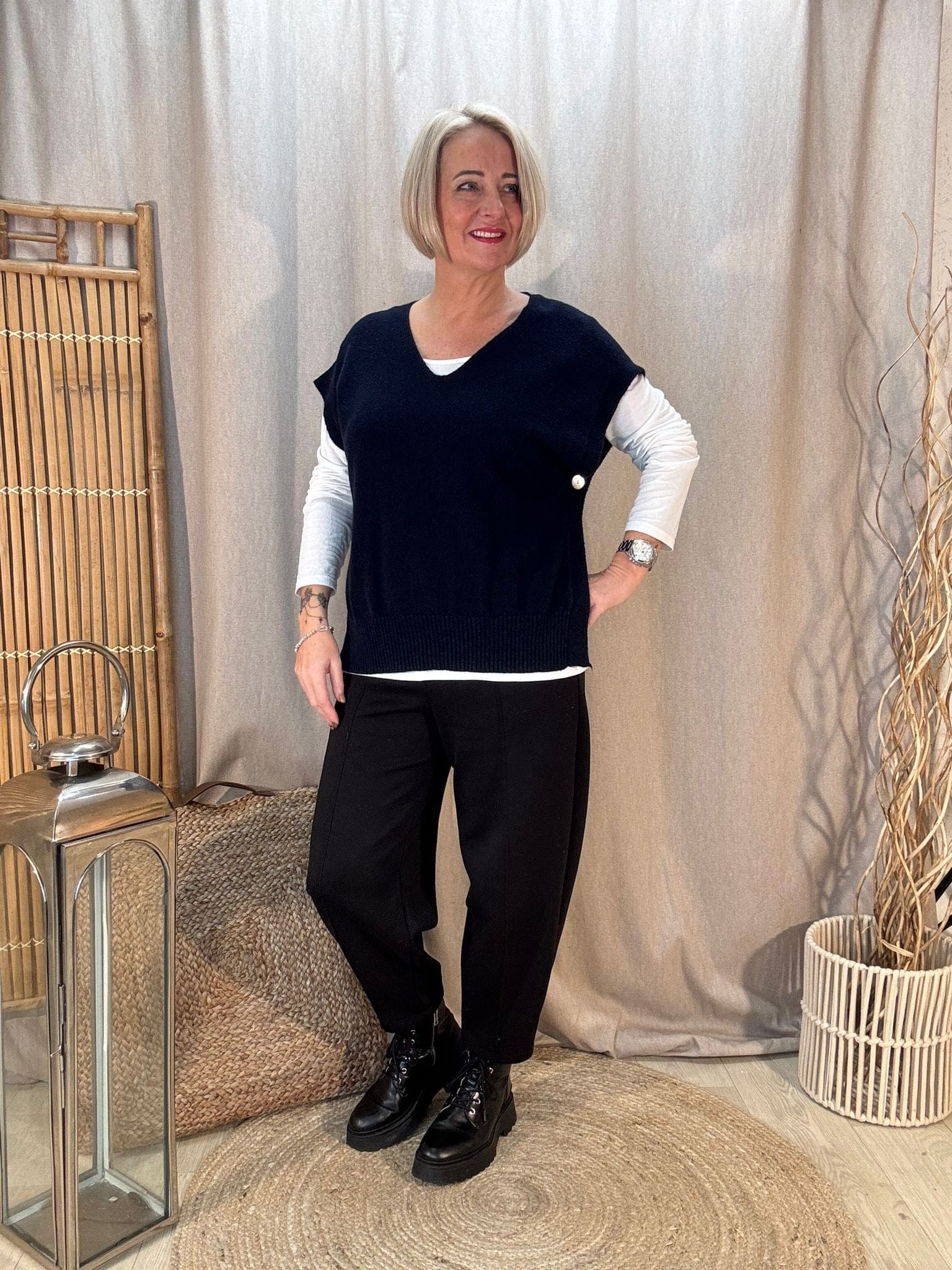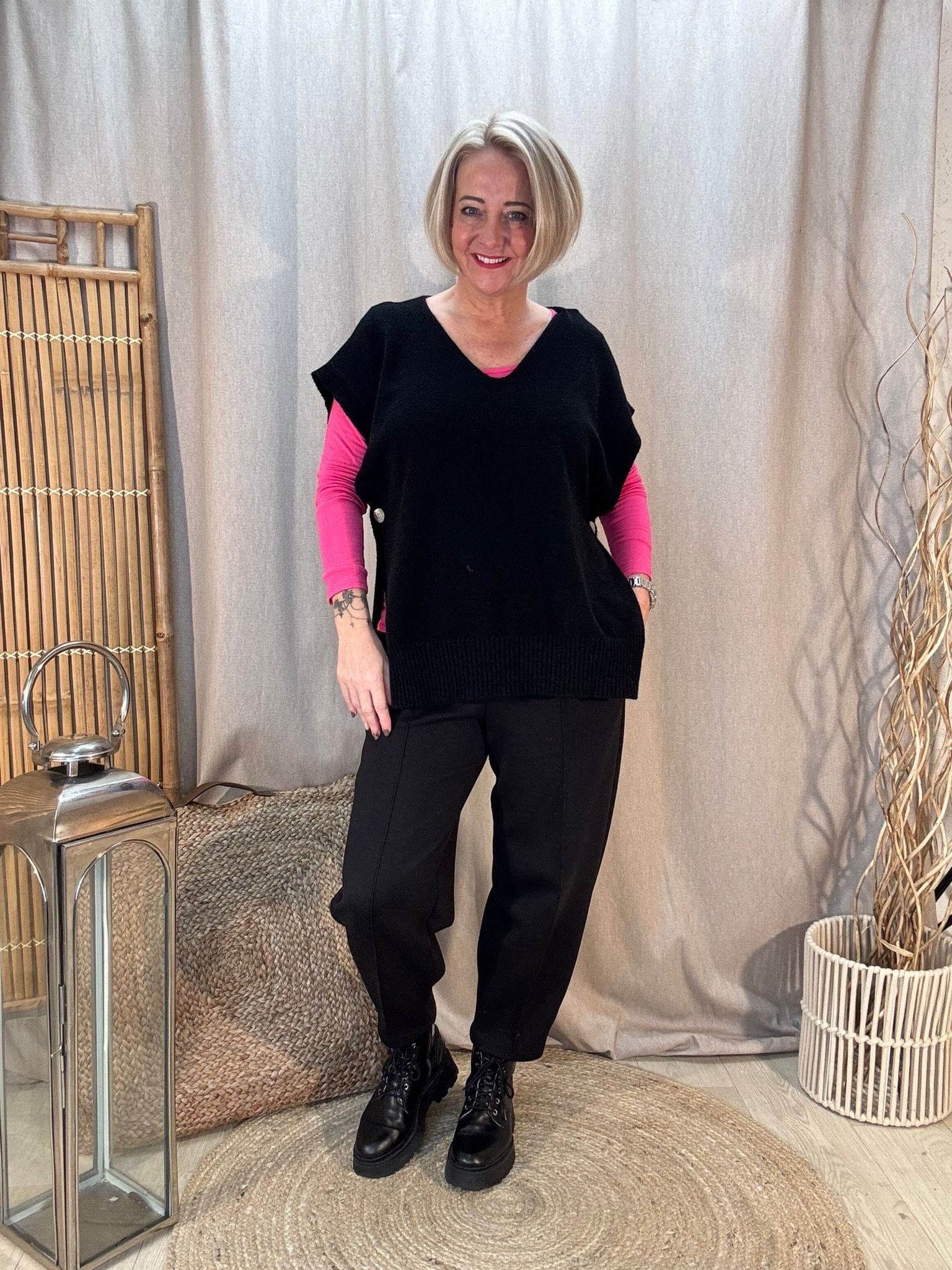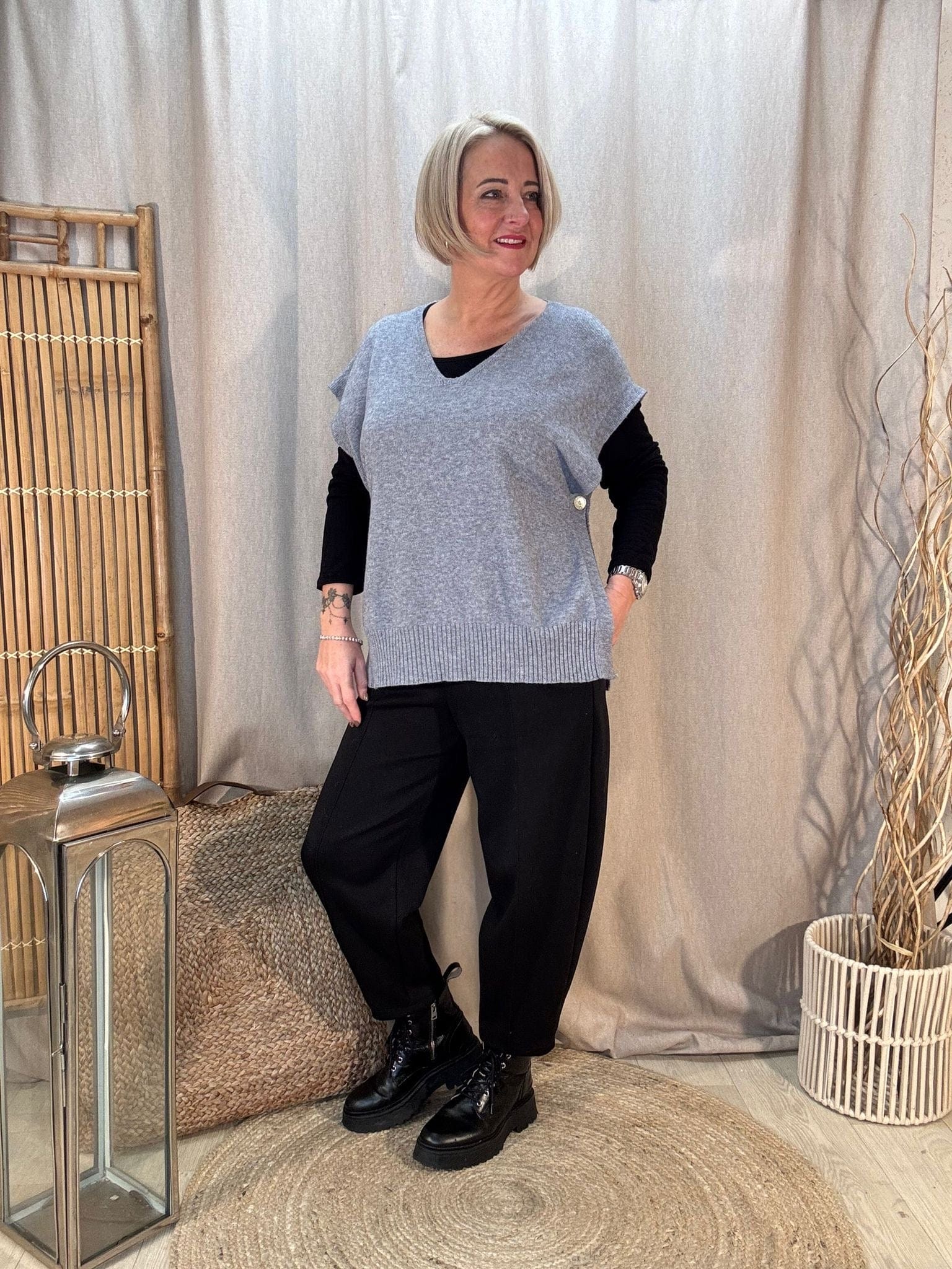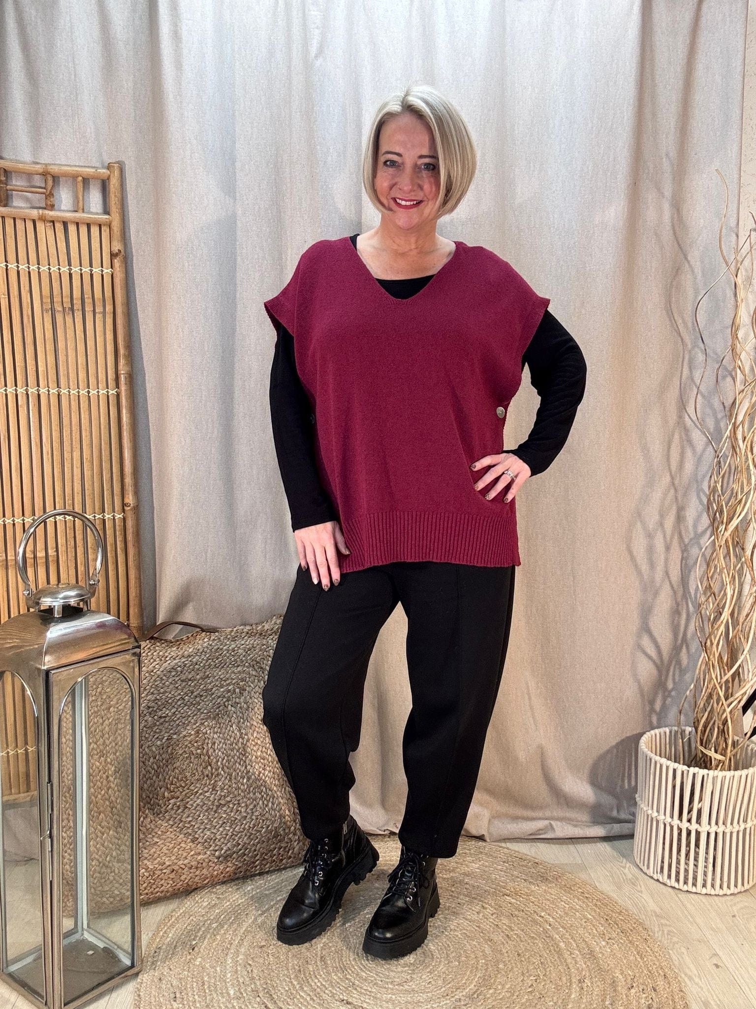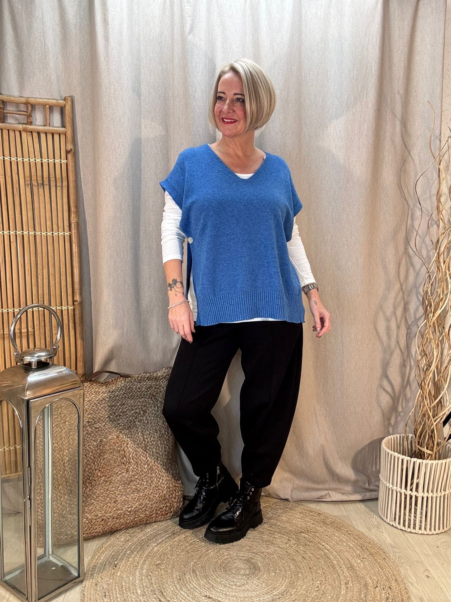 - Premium knitted tank top with a v neck & button sides
