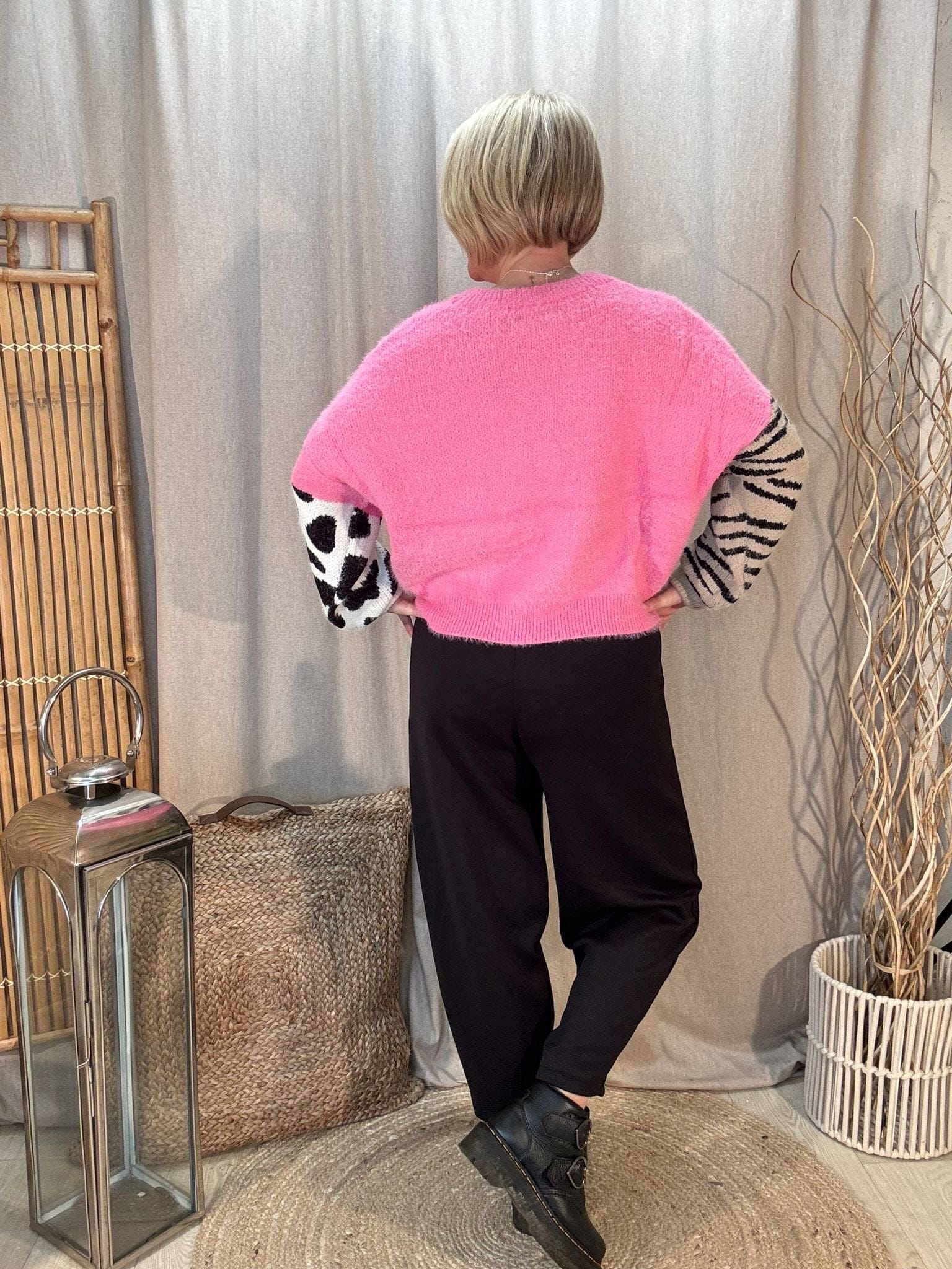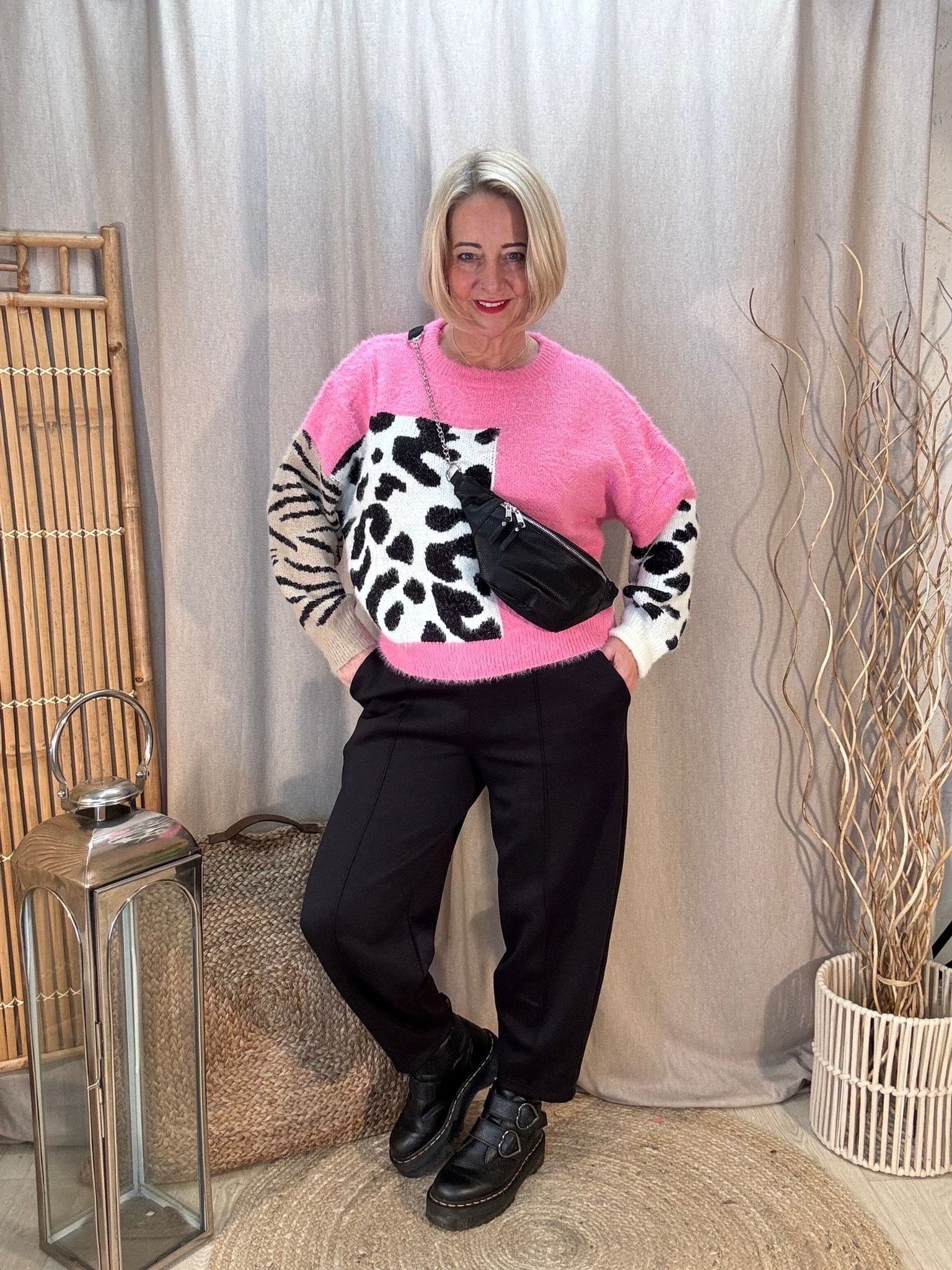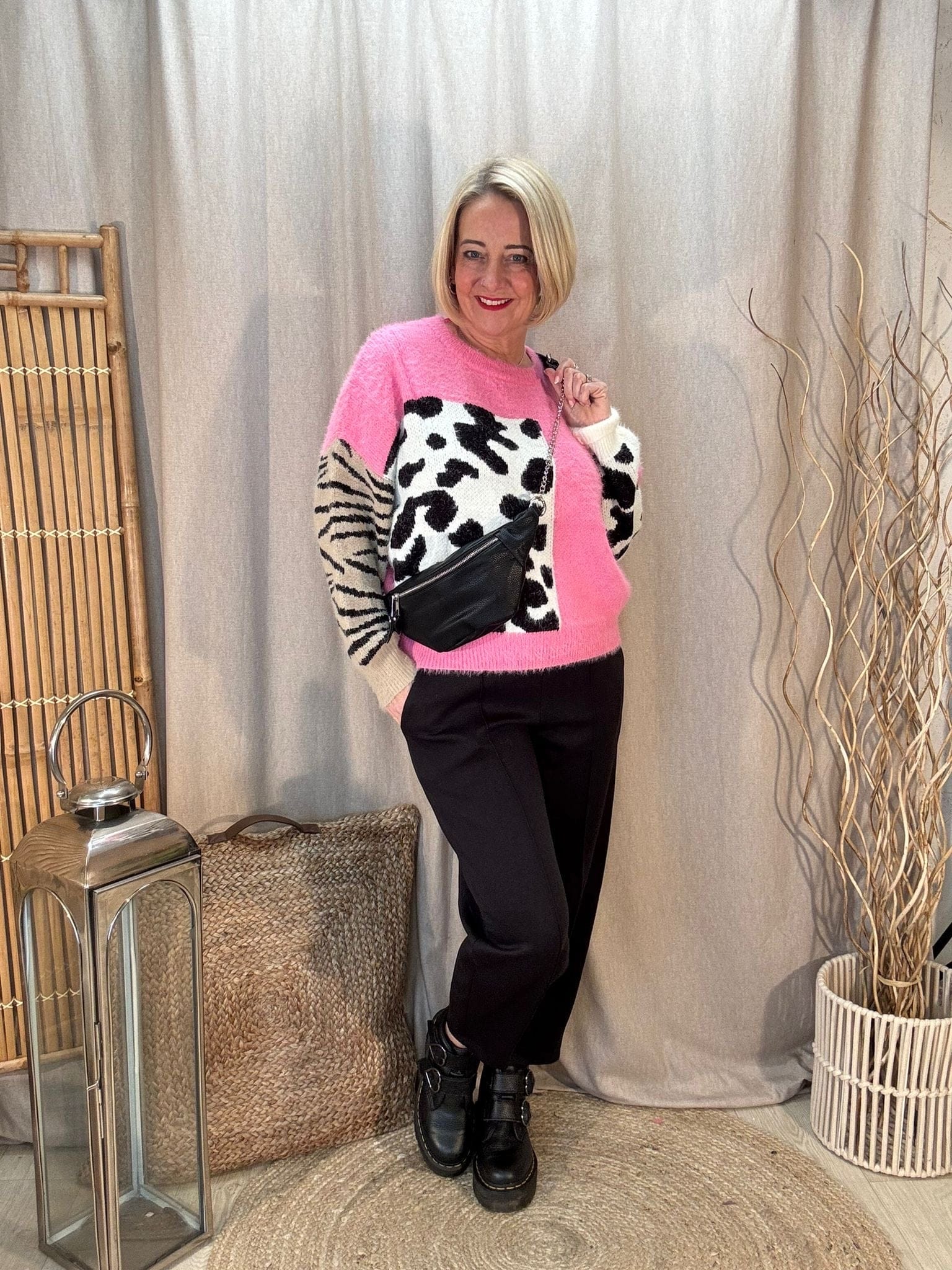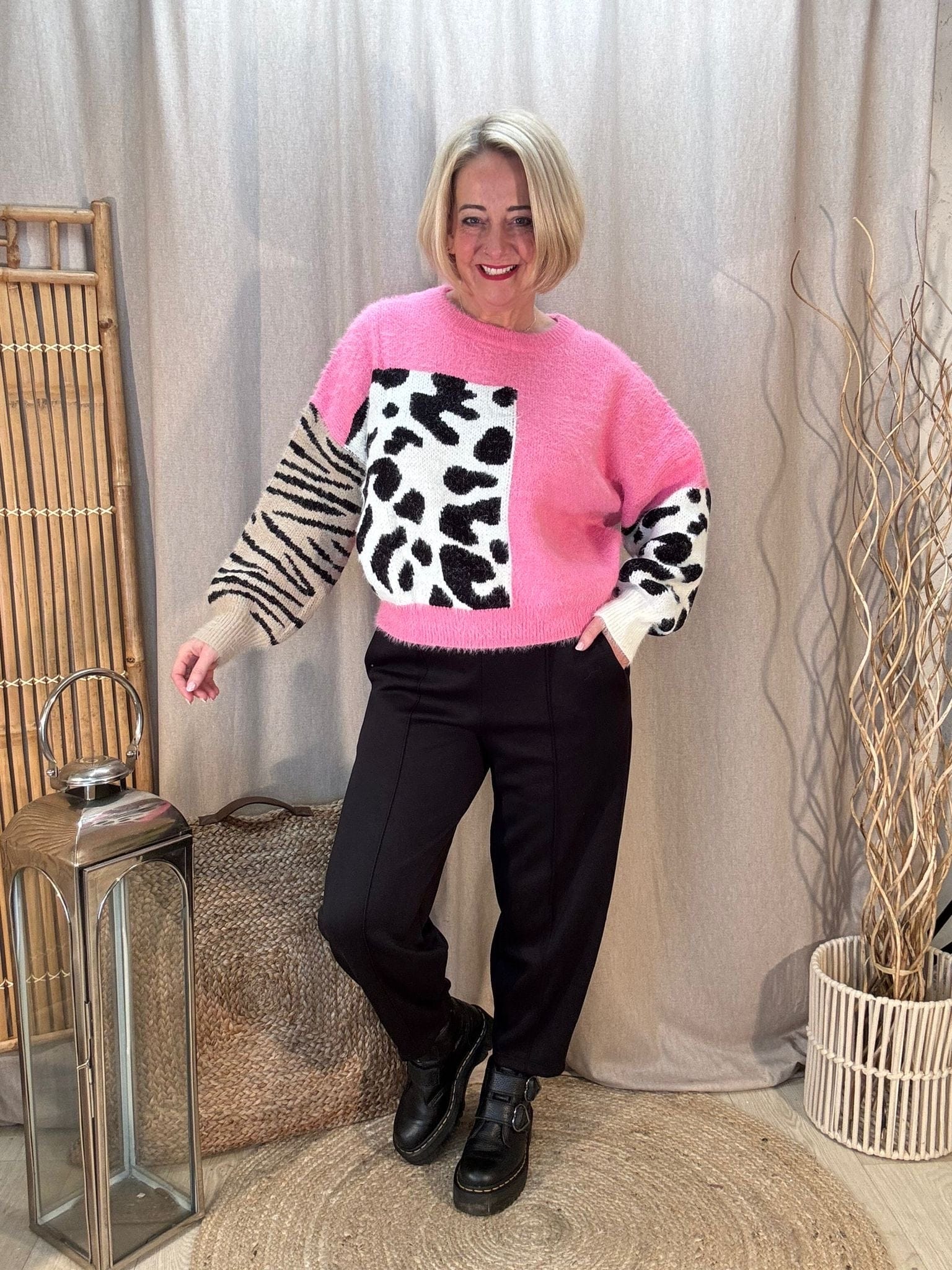 Bright Pink Multi Animal Print Fluffy Knit Jumper
