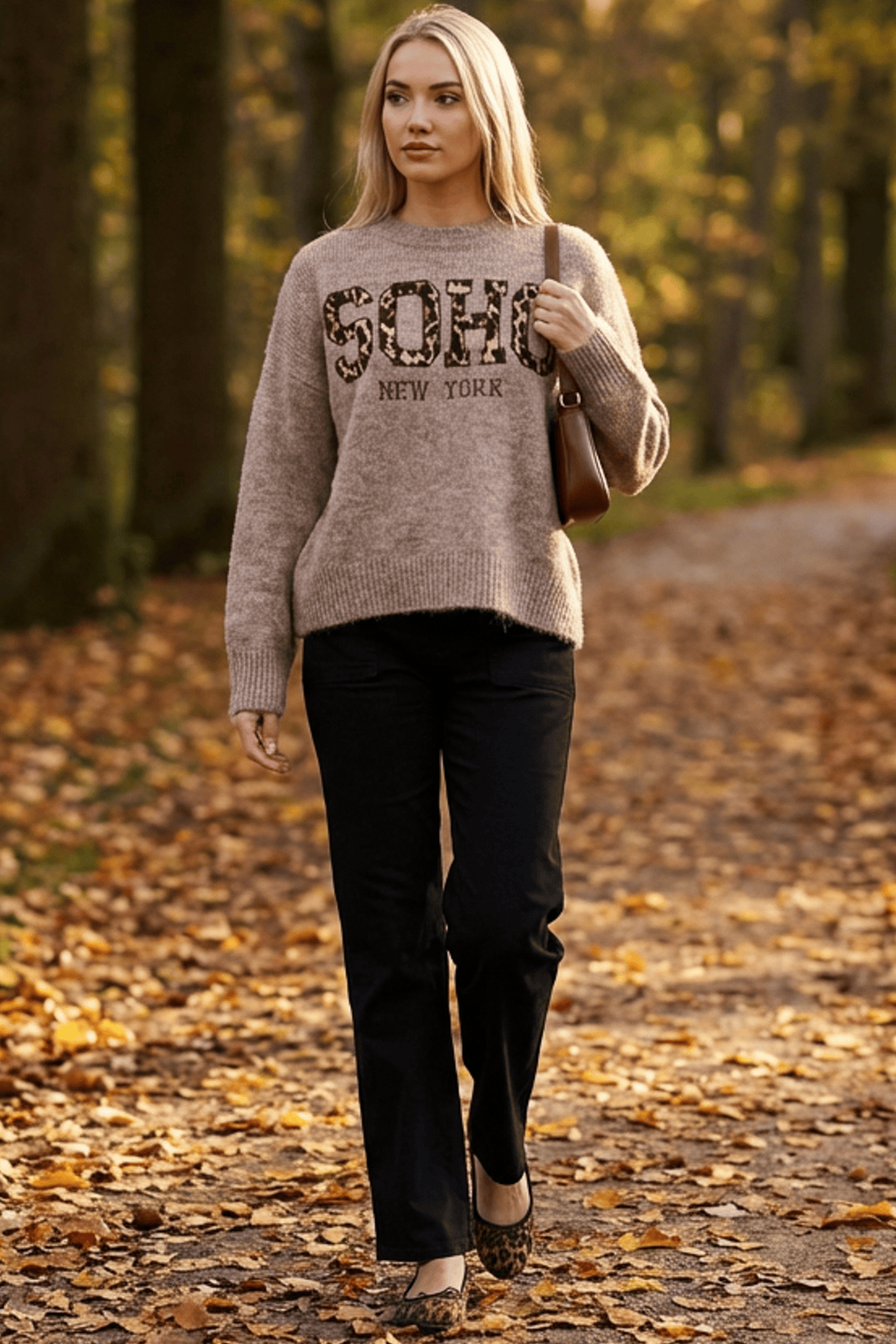 - Soft & warm jumper with SOHO New York slogan in embroidered leopard print